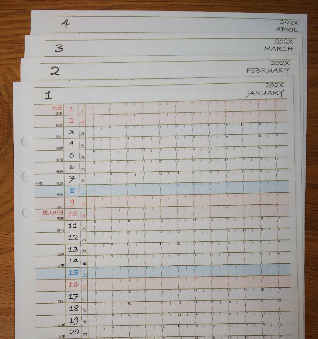A4の二つ折りになっていて、月前半は後ろへ折り返し、